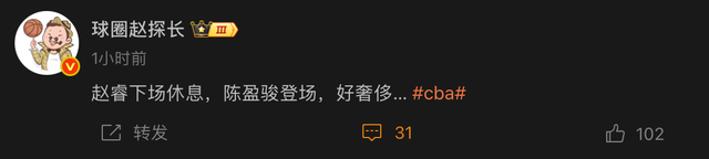 媒体人球圈赵探长更是强调北京队的后场太奢侈了:“赵睿下场休息,陈盈骏登场,好奢侈。”此役赵睿只登场8分钟47秒,5中3拿下8分1篮板1助攻1抢断,比分早早拉开,赵睿更多时间在场下休息。