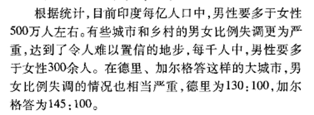 连德里和加尔各答这样的大城市,男女比例都可以达到惊人的130:100和145:100,更别说其他欠发达地区了。
