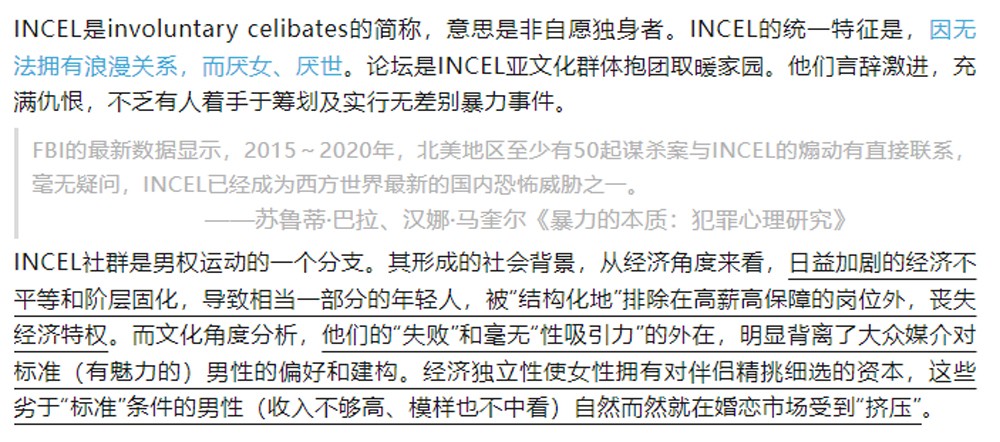 这其实就是很典型的incel心态,即因经济、长相或性格原因陷入“非自愿单身”状态。