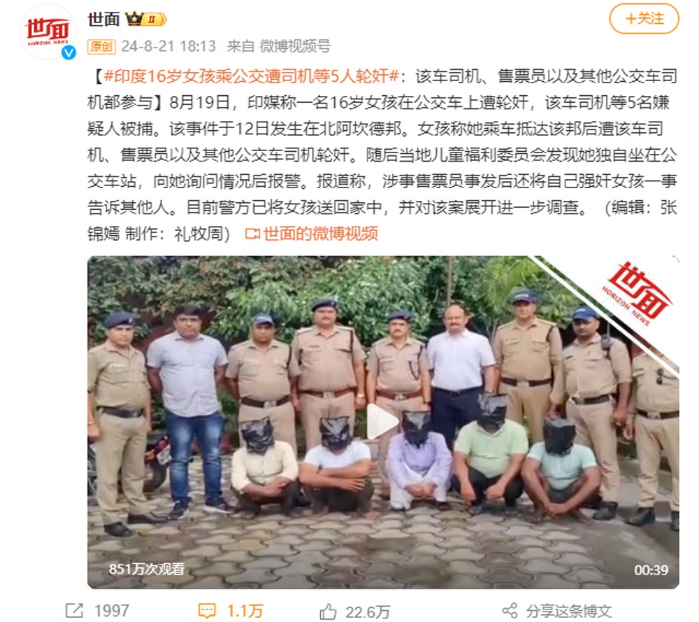 “印度16岁女孩乘公交遭司机等5人轮奸”