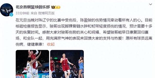 1月3日消息,北京首钢俱乐部官方宣布,球员陈盈骏脚踝骨髓水肿和韧带轻度损伤,预计伤停十多天。