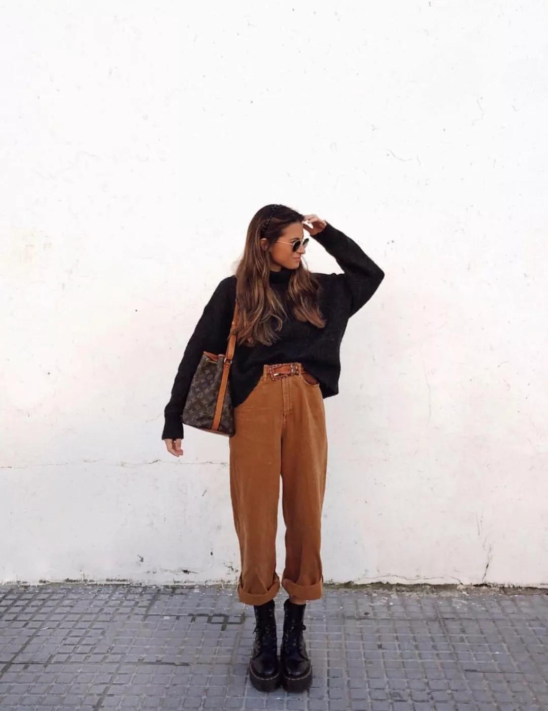 将裤子塞进鞋子里,大腿部分又足够肥大,会在视觉上完美呈现一种军装的帅气,这种只有女性能够传递出的飒爽英姿,全部的功劳都应该给这双马丁靴,今秋,就穿它吧。
