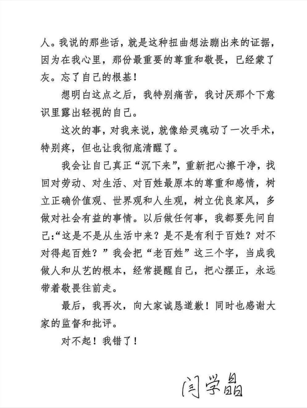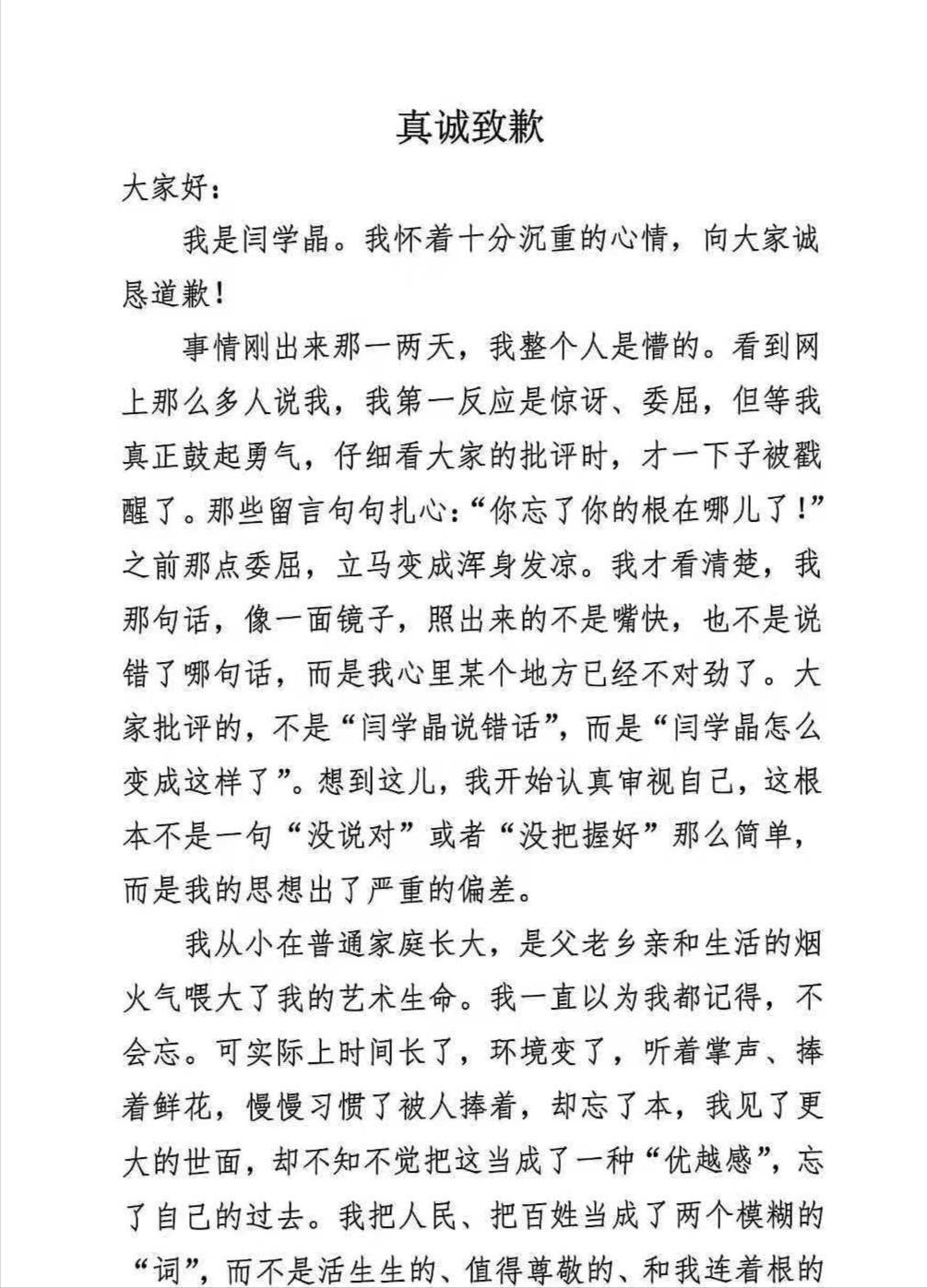 本来还想靠沉默混过去的闫学晶,这下彻底慌了,赶紧在朋友圈发了打印的道歉信,说自己被追捧久了思想跑偏,忘了本。