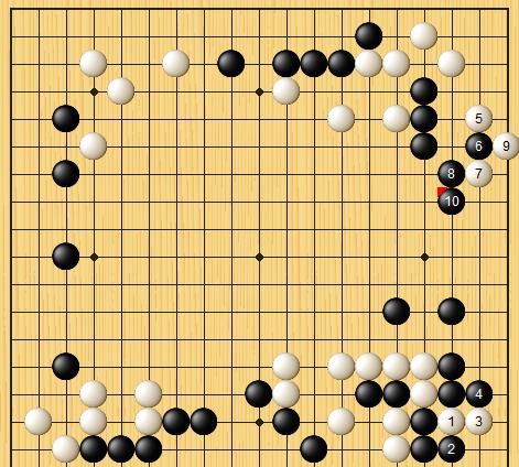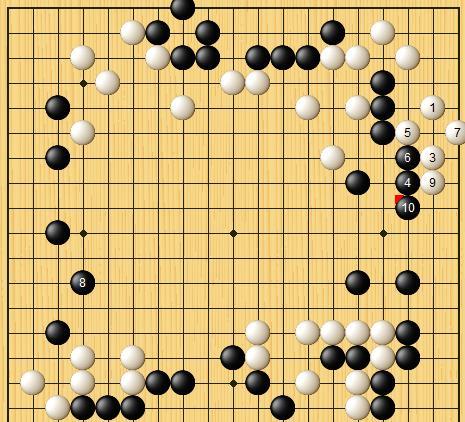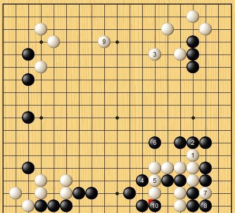 AI认为,白1断,好时机。黑2,4,最好的选择。白5小飞,7夹,白棋实实在在地找到了根基。如图,白棋的胜率为42%。实战,黑棋的胜率升至72%。