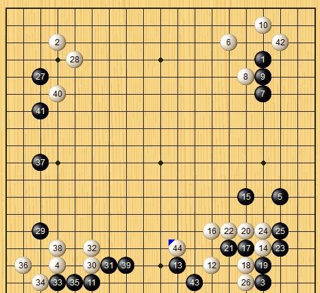 第6届吴清源杯世界女子围棋赛决赛三番棋第一局,韩国第一人崔精九段执黑棋迎战日本第一人藤泽里菜六段。白44靠,藤泽里菜六段走出了随手棋。