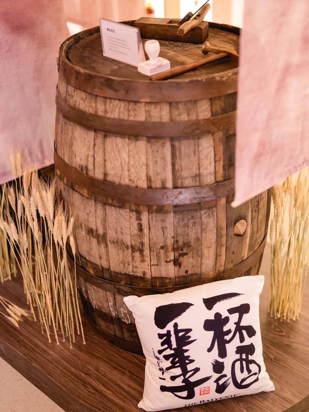 金黄色的大麦、橡木桶及酒厂老物件展示