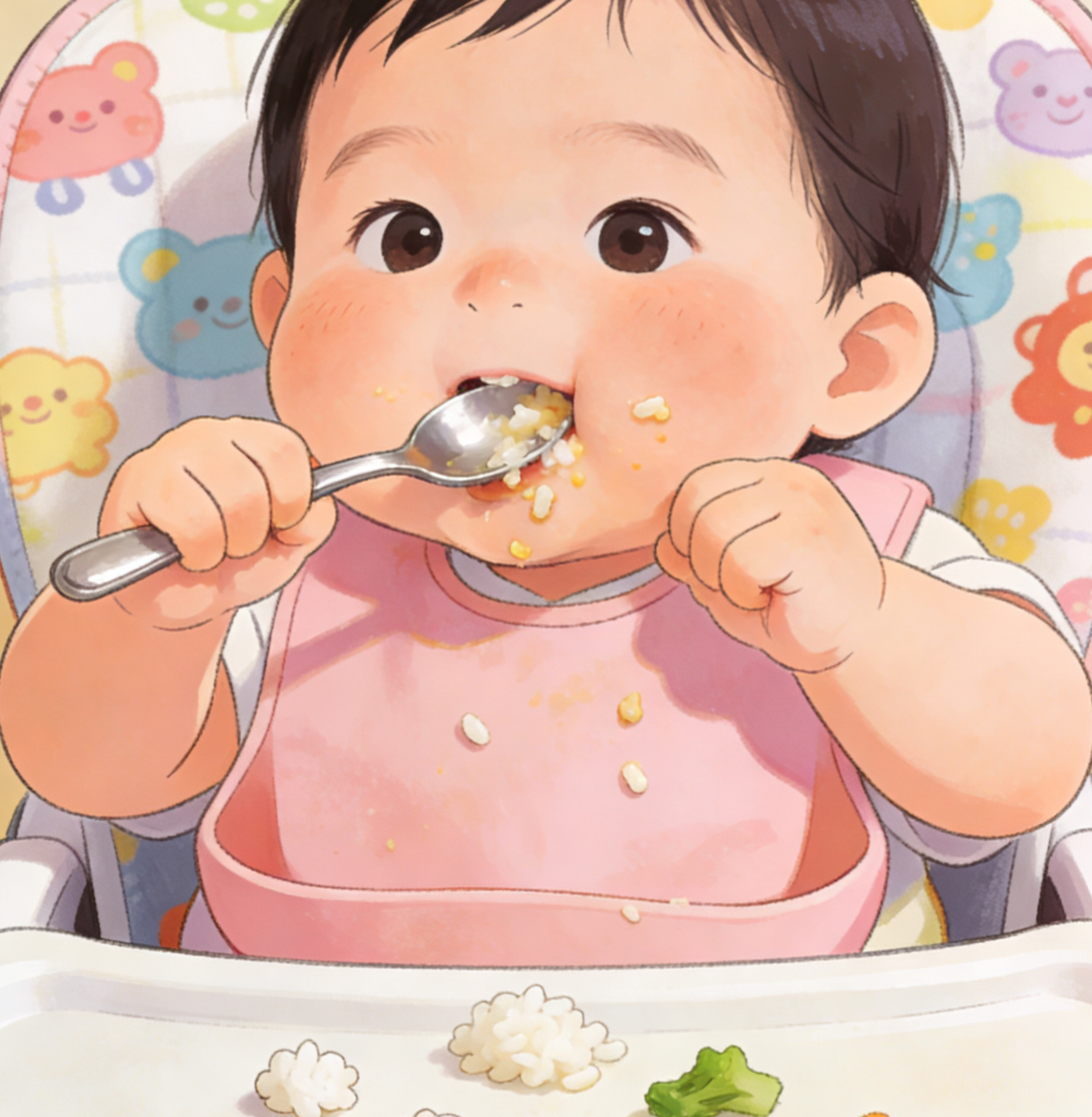 10-12个月:接近成人,自主进食 每天3餐辅食+2-3次奶,逐步向软烂固体食物过渡。(如软饭、小馄饨、碎菜、肉末、小块水果(切小丁)),鼓励宝宝自己用手抓、用勺子吃,培养自主进食;少量加盐(每天≤1g),仍不加糖。食材:如全蛋、瘦肉、鱼虾、豆制品、各类蔬菜,饮食多样化。