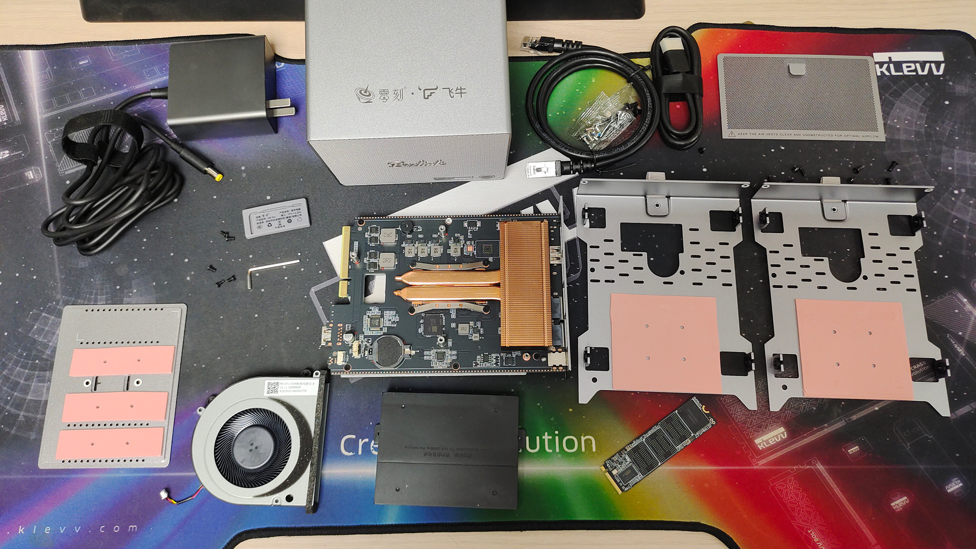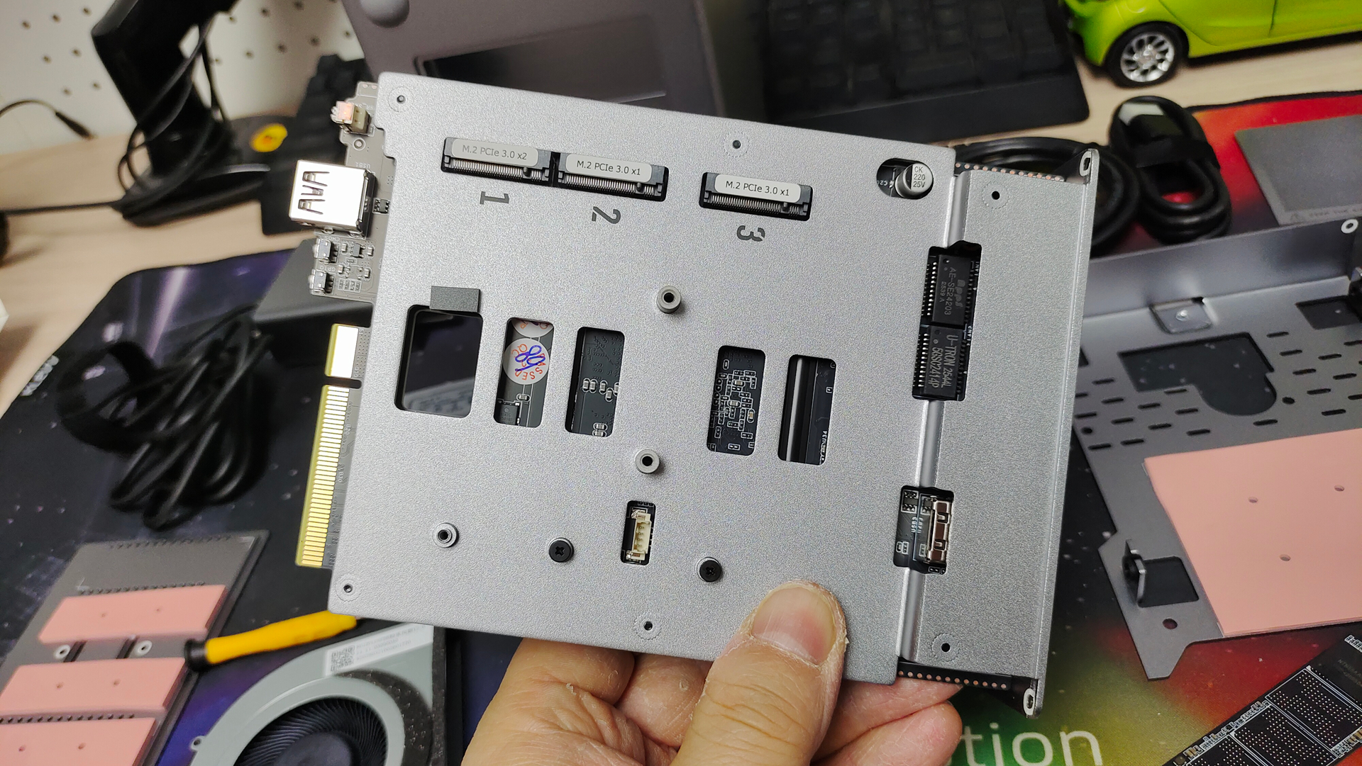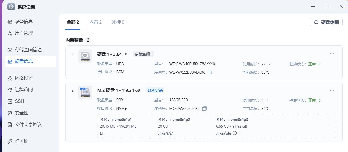 拆掉底部中心的盖板,我们可以看到这里有3个M.2 2280 SSD插槽(1个PCIe 3.0×2 + 2个PCIe 3.0×1)。其中一个是自带的系统盘,容量128G,已经预装了飞牛NAS系统。