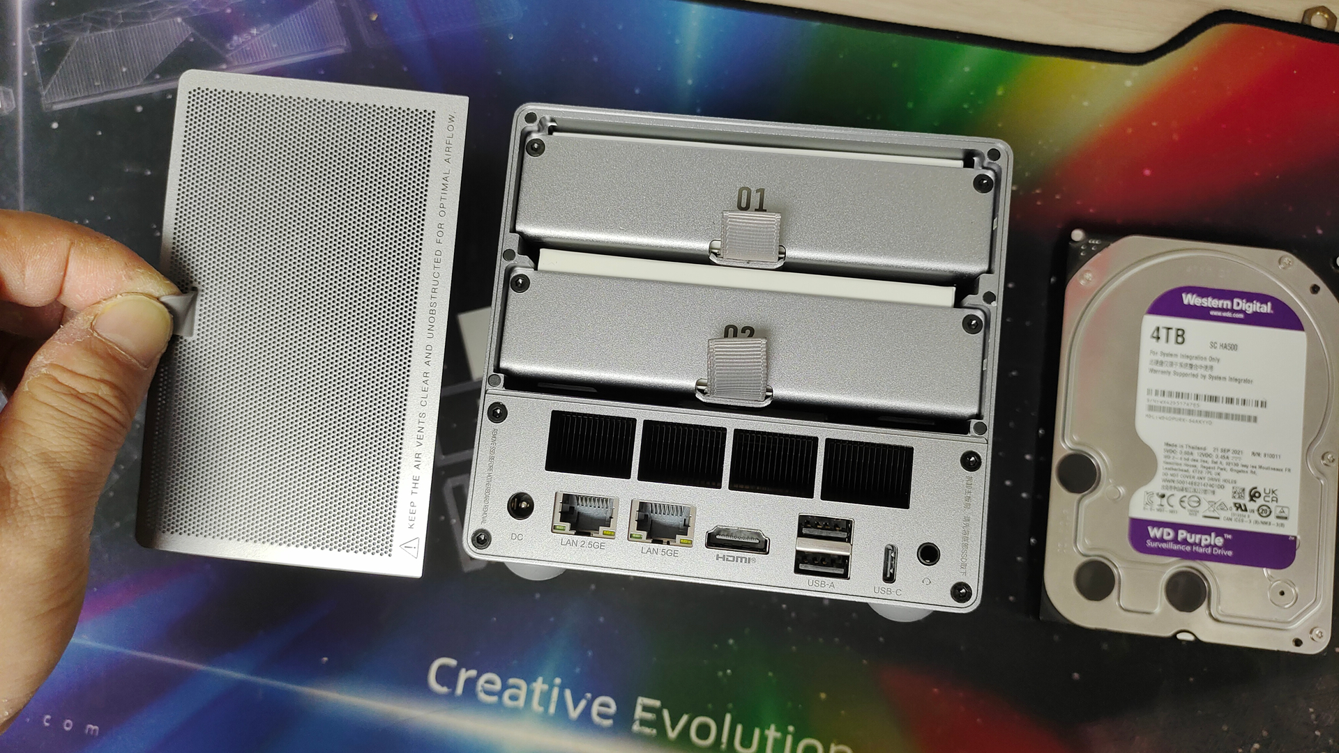 来到机器背后,我们可以看到上面是一个磁吸式防尘网,防尘网配有硅胶提手方便拆卸,里面就是硬盘仓。