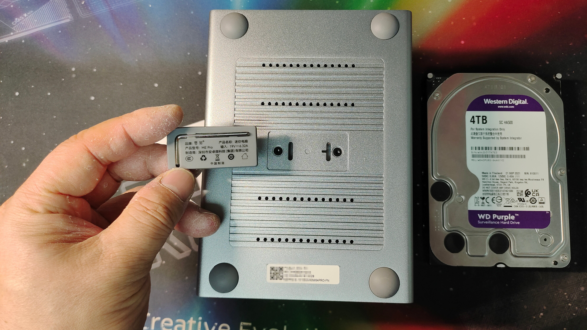我们将机器翻过来,可以看到机器底部有四个半球型的硅胶垫,正中还有一个硅胶盖,上面印零刻ME Pro的电源参数。事实上,这个硅胶盖除了用来盖螺丝孔,还有另一个作用是用来收纳随机赠送的内六角扳手。有了它,我们就可以快速上手拆卸硬盘笼了。