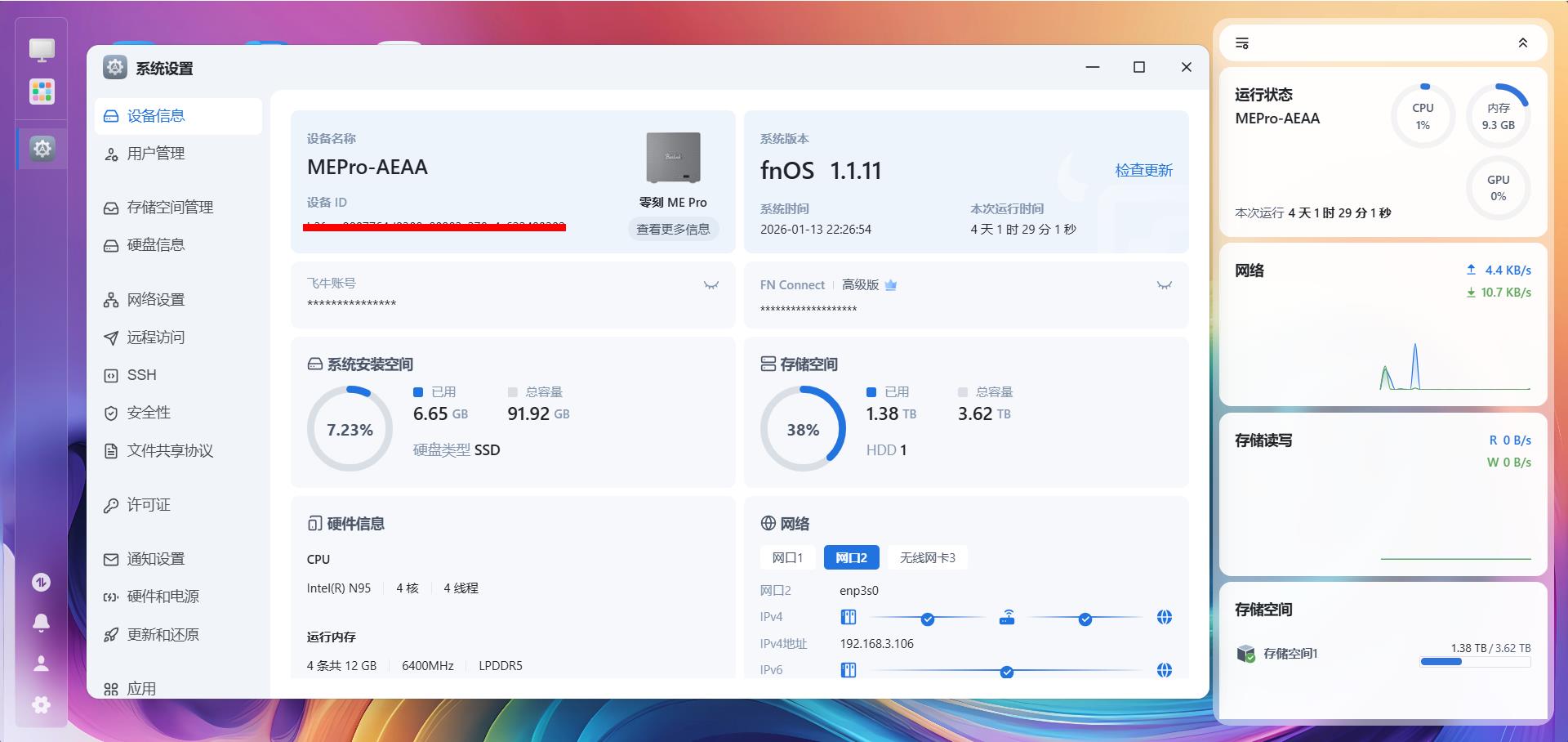 将主板和硬盘安装好,就可以直接通电开机使用了。零刻ME Pro自带的飞牛系统上手非常简单,全部图形化的操作,几分钟就能配置完成。