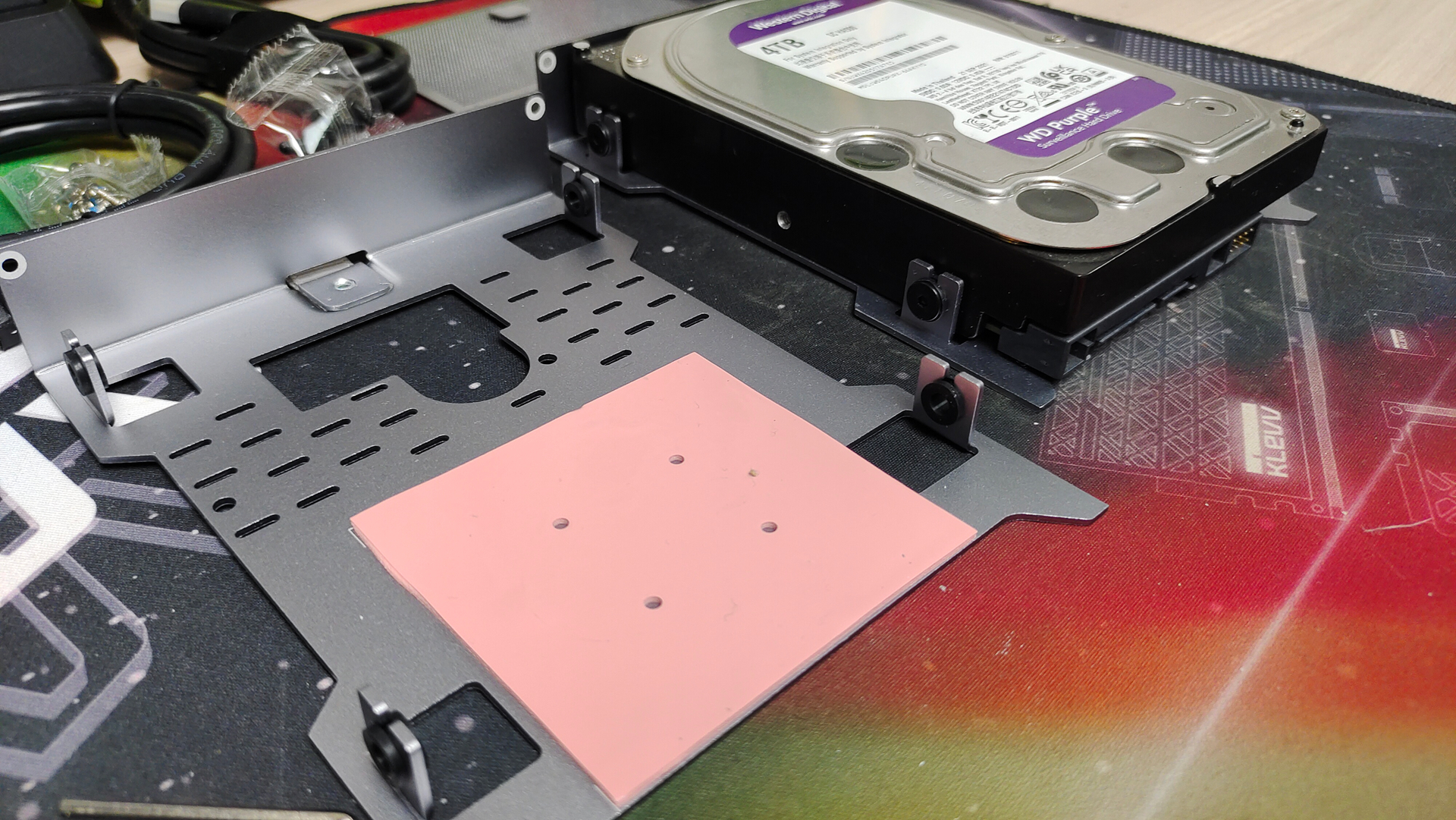 用随机赠送的螺丝配件将硬盘安装到硬盘笼上,我们可以看到,硬盘笼设计的非常小巧,和硬盘结合后,体积并没有比硬盘大多少,看来设计师真的用心了。