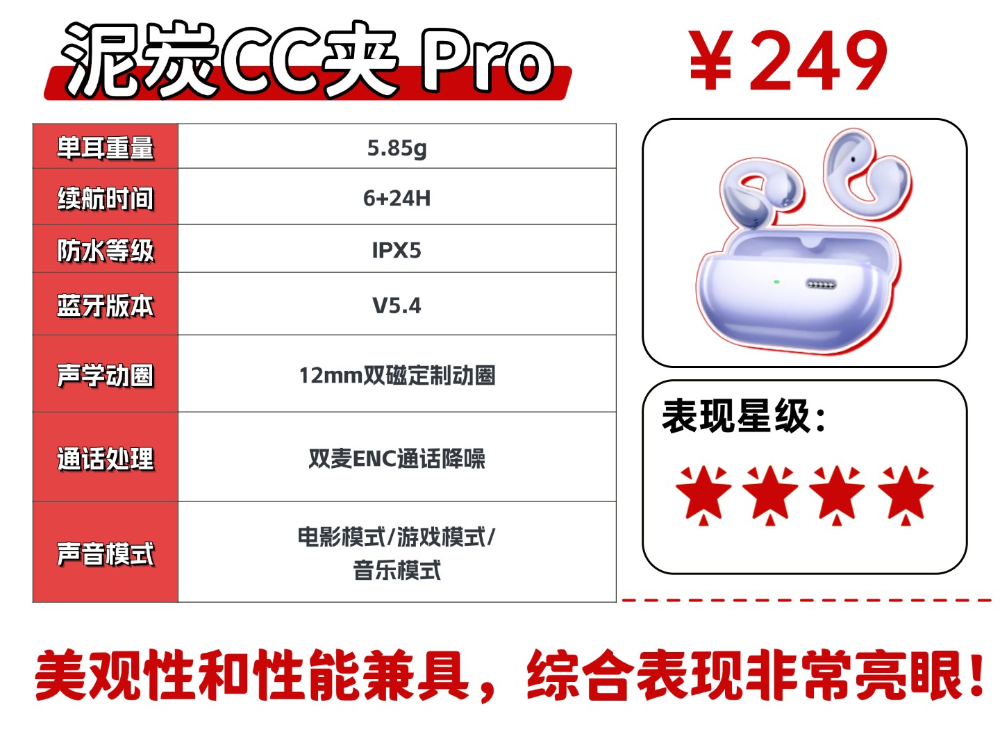 如果预算稍高,平时喜欢追剧、打游戏,看重听音的沉浸感,泥炭 CC 夹 Pro可以考虑。249 元的价格,有三种声音模式,音质均衡,佩戴也舒服,看电影、玩游戏时的空间音效体验很好,兼顾了实用性和使用体验,适合影音娱乐需求比较多的人。