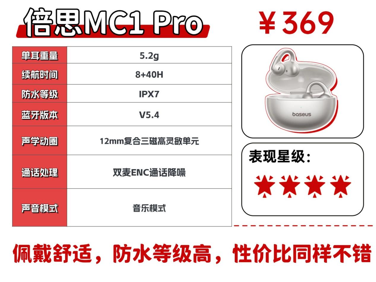 如果预算在三百多元,是户外运动爱好者,注重耳机的防水性和佩戴稳固性,倍思 MC1 Pro 就是最合适的。349 元的价格,IPX7 的顶级防水等级能应对各种遇水、出汗场景,云朵气囊 Pro 设计让佩戴既舒服又稳固,剧烈运动也不用担心脱落,续航和音质的表现也很均衡,是运动场景的不二之选。