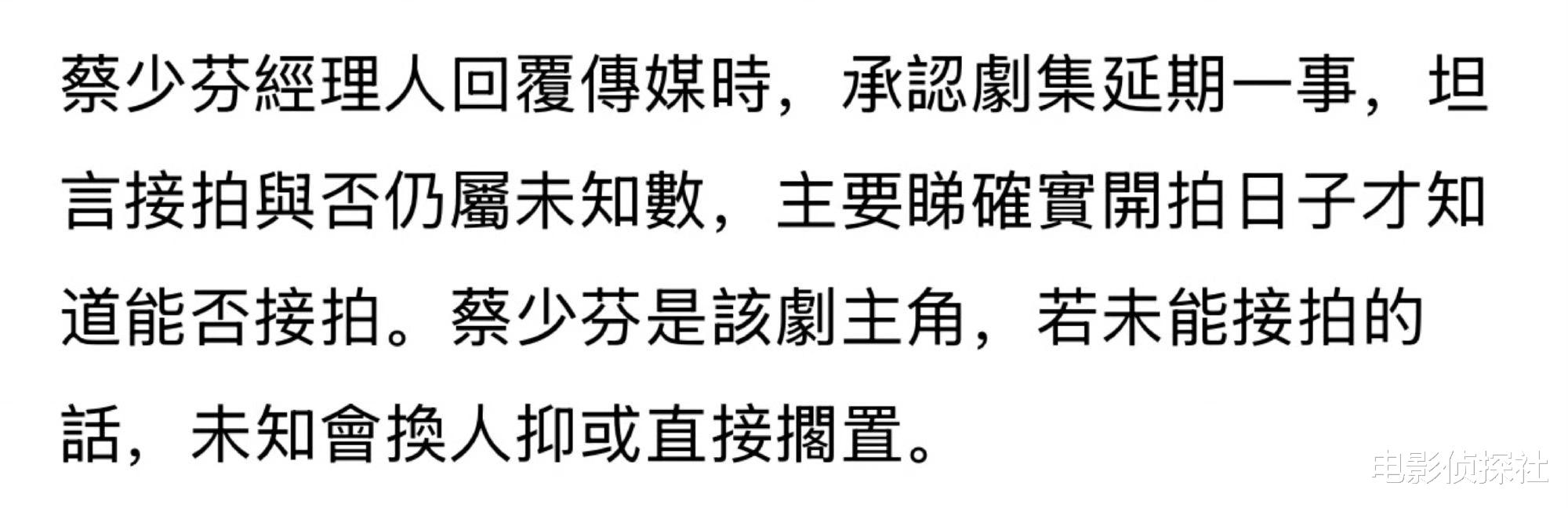 随后蔡少芬的经纪人向媒体回复,承认剧集延期一事,并坦言接拍与否仍是未知数,主要看具体开拍日子才能决定是否接拍。