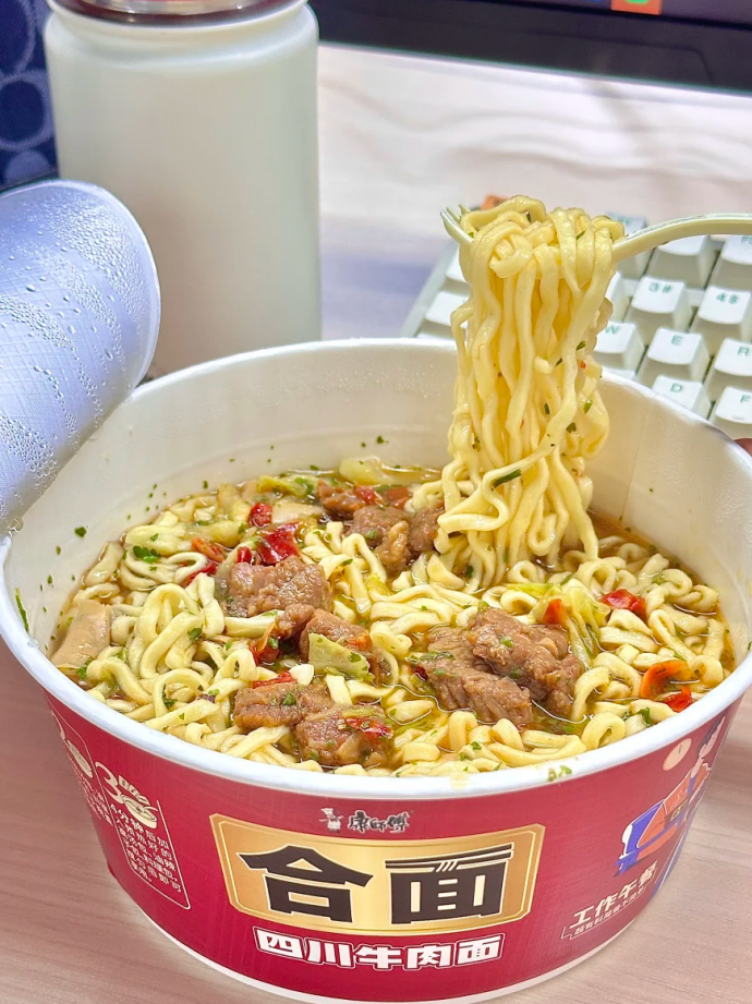 “料满”,是最直接的年味和富足感的表达。在春运路上,一份用料扎实的面,是对自己一路辛劳的最好犒劳。康师傅的 “合麵”系列 直击“正餐化”需求,其“料满”体现在“有菜有肉有汤有宽面”的完整解决方案上。运用锁鲜技术,大块原切肉粒泡开后仍能保持鲜嫩,蔬菜也能恢复脆爽,一碗下去,能量与满足感兼备,完美应对旅途中的能量消耗。