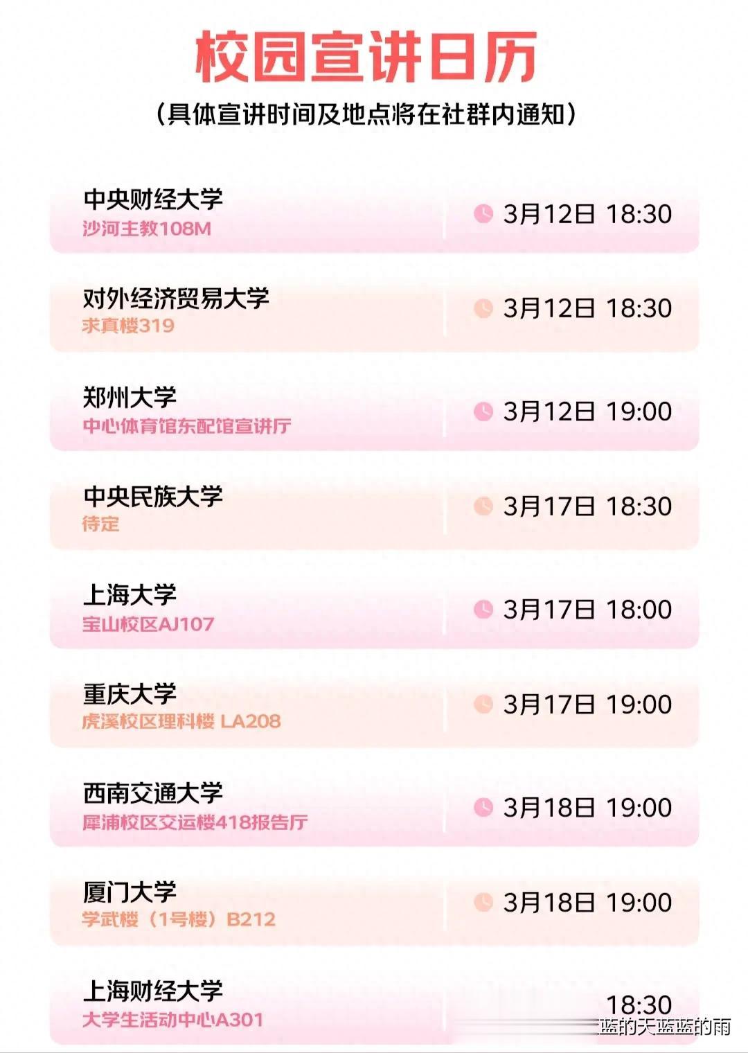 有想去的场次最好提前加一下学校的校招社群,部分地点和具体时间还在待定,群里会第一时间通知。