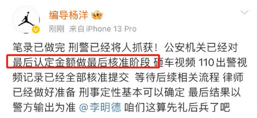 杨先生本就是个通情达理的人,想着大过年的,只要李明德能赔偿车辆损失,也不想过多为难他。于是双方在警官的见证下签署了调解协议,杨先生便安心去处理车辆维修事宜了。本来以为事情到这里就结束了,该赔钱赔钱该修车修车,一个演员公众人物,几万块钱能解决的事情那都不叫事。
