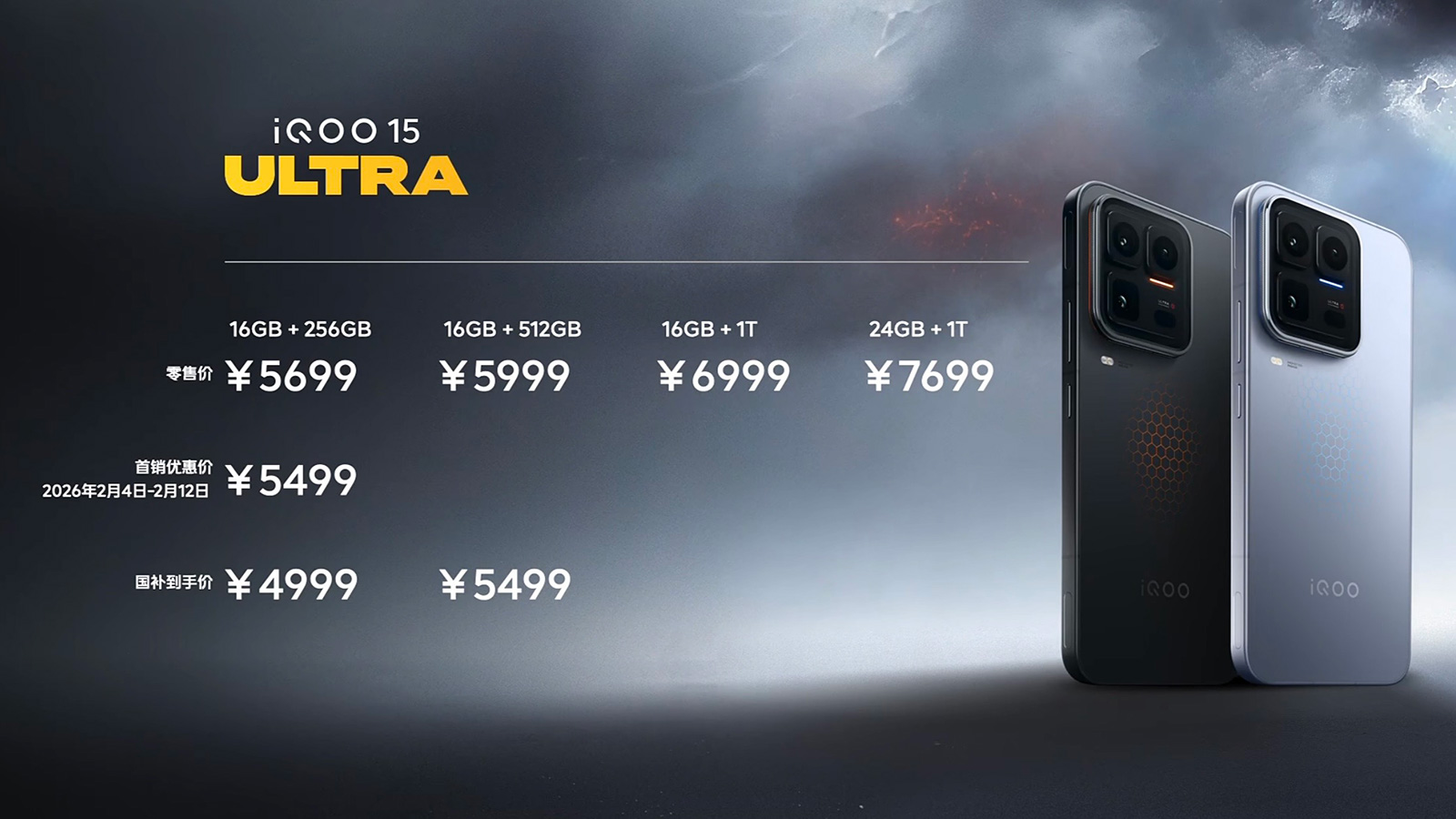 iQOO 15 Ultra定价5699元起,首销限时优惠5499元起,256GB与512GB版本相比iQOO 15涨价1000元,不过还是很精准的卡位6000元内的国补优惠。1TB版本涨幅达到1500元,其中16GB+1TB版售价6999元,24GB+1TB版为7699元,刷新了iQOO手机的价格新高。