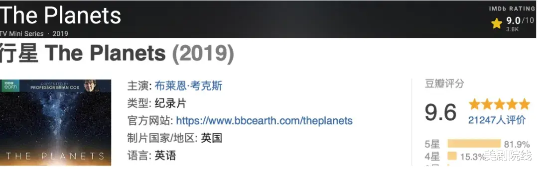 全片只有五集,却几乎把太阳系的故事讲得明明白白,而且拍得好到你怀疑BBC是不是租了宇宙的实景来拍。