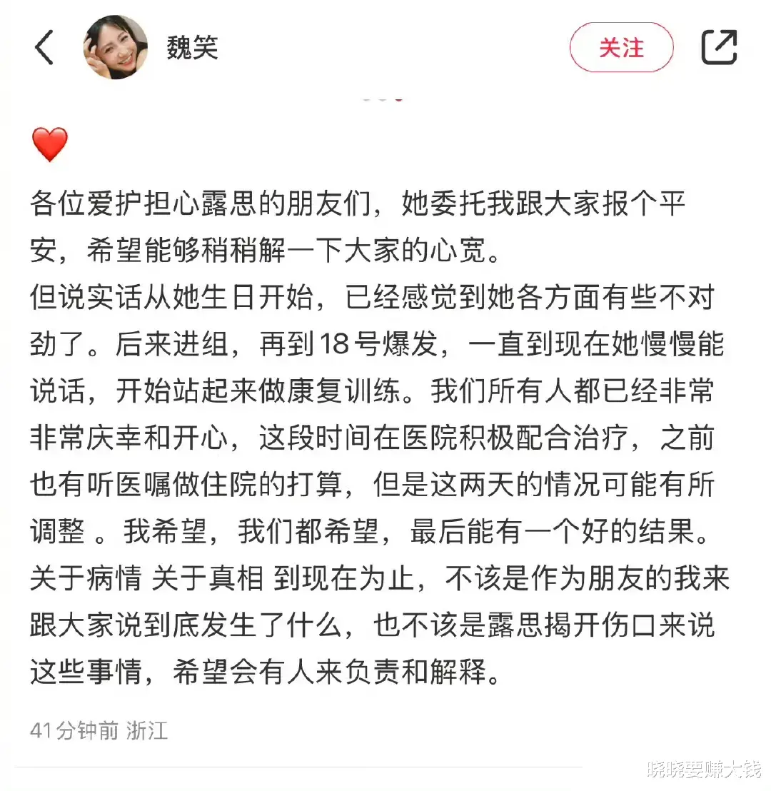 所幸,在亲友的支持与专业医疗团队的帮助下,赵露思开始了艰难的康复之旅。魏笑分享了一个令人欣慰的消息:赵露思如今已能开口交谈,虽然声音尚显微弱,但这象征着希望的火种。她正积极投入康复训练,一步步向着光明迈进,展现出非凡的勇气与毅力,鼓舞着每一个关心她的人。