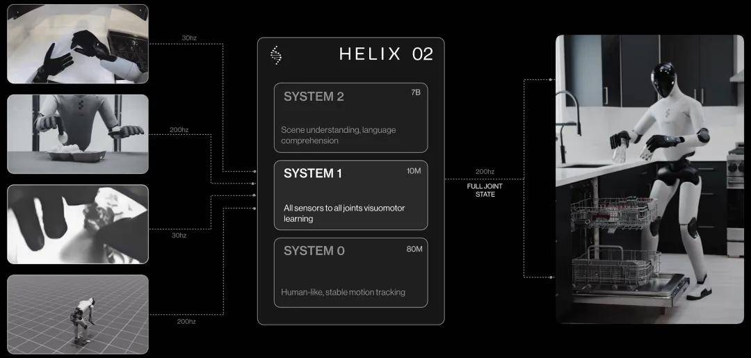 Figure的突破在于构建了一个能同时对全身进行推理的单一学习系统。Helix 02采用分层架构,每个系统在其自然的时间尺度上运行: