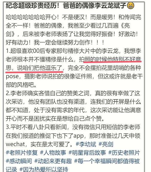 去年李幼斌拍摄写真时,工作人员还晒出合影并记录了过程,称李幼斌本人不是硬汉,而是一位暖男。