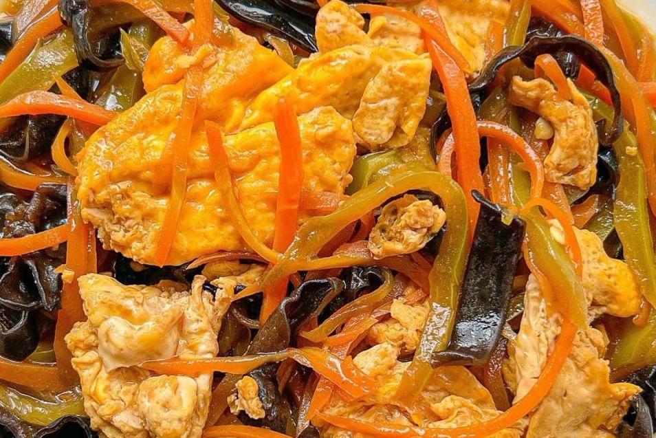 准备鸡蛋、青椒丝、胡萝卜丝和木耳等食材。