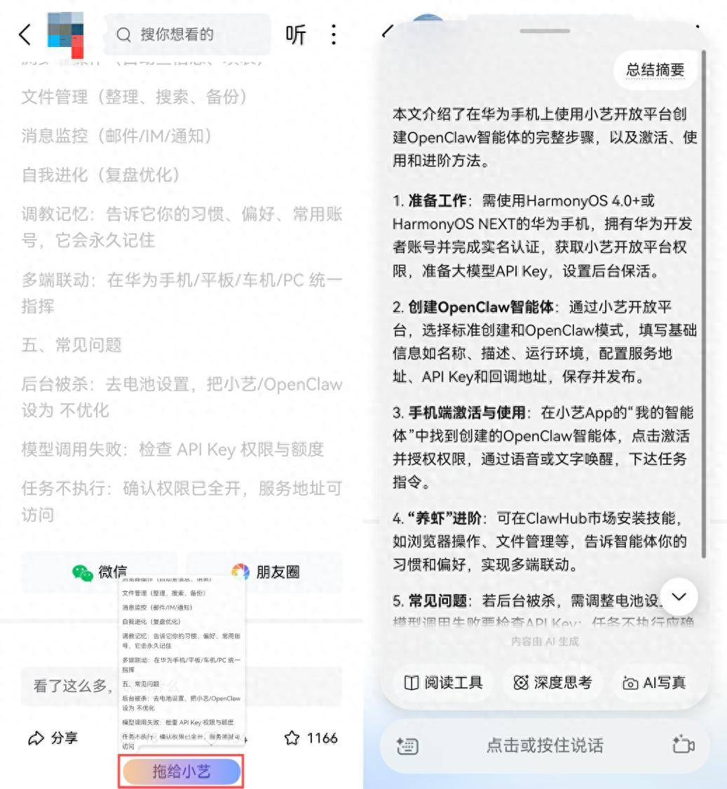 阅读更快:今日头条、知乎、凤凰新闻上刷到长文没空细看,拖给小艺,摘要直接甩给你。