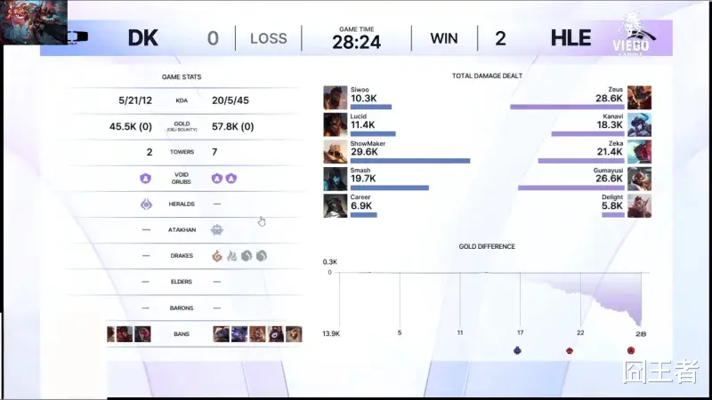 结果第二局比赛,又是被HLE打成了单方面的碾压局。比赛前20分钟,双方打得比较胶着,经济一直无法拉开差距。比赛第20分钟左右,HLE抓掉ShowMaker沙皇后又抓掉DK野辅,先后打出0换3拿到听牌小龙。此后HLE牢牢占据主动;比赛第24分钟左右,HLE一波打出0换4大胜,此后HLE迅速拉开一万经济差;最终比赛第28分24秒,HLE再次打出0换4,随后HLE迅速一波结束比赛。
