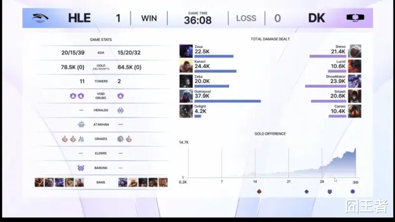 结果这一局比赛,HLE在前期就利用优势,打出了4000的经济领先。比赛第30分钟左右,HLE大龙逼团先后一波打出1换4并拿下大龙;比赛第32分钟左右,DK抓到HLE上野将其击杀,但HLE迅速稳住局面;最终比赛第36分08秒,ShowMaker辛德拉埋伏失败被Zeka发条单杀,HLE击杀DK双C后迅速一波。