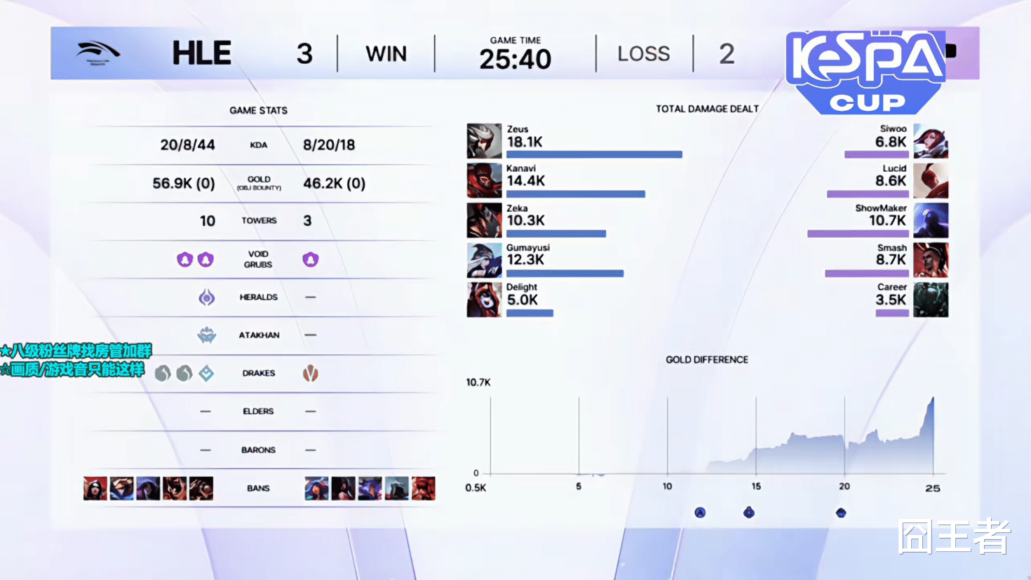 结果决胜局的比赛,变成了HLE的表演赛。比赛前期,HLE取得明显优势,比赛第16分钟左右,HLE取得4000的经济领先;比赛第23分钟左右,两队爆发激战,HLE打出3换3后进一步扩大优势;最终比赛第25分40秒,HLE一波打出0换5后结束比赛。