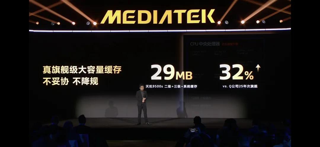 请注意,天玑9500s的缓存配置依旧是满配的,并没有因为定位问题而阉割,其搭载了7MB L2缓存、12MB L3缓存以及10MB SLC缓存,总缓存数达到了29MB。