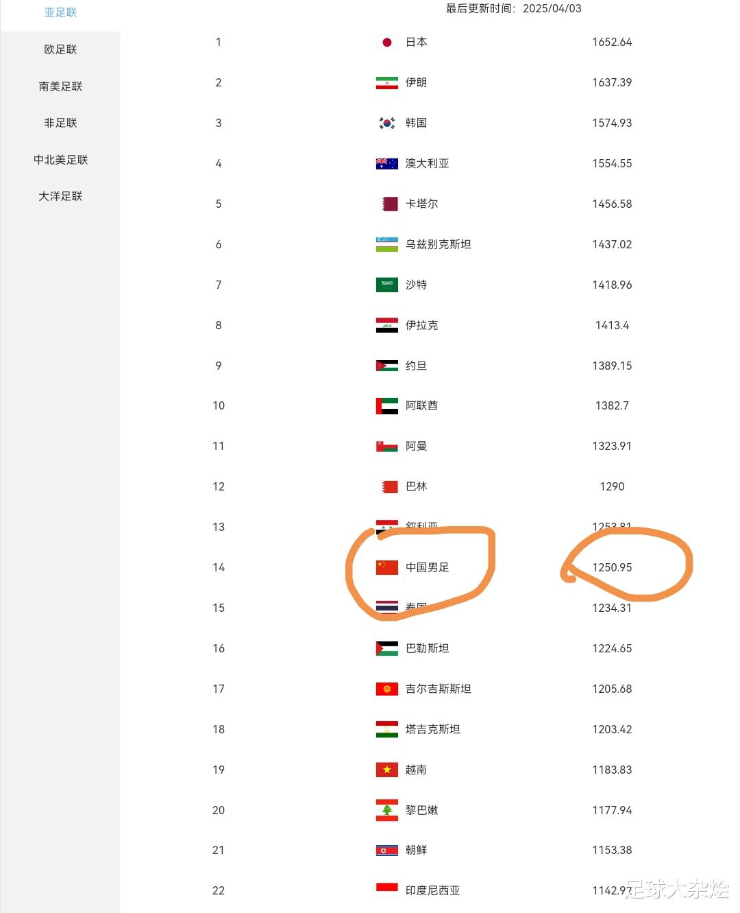 从亚洲范围来看,日本排在第一位,伊朗第二位,韩国第三位,国足第14位,落后于叙利亚,比泰国高,不过看积分情况,泰国与国足相差不大,可能下次就被泰国超越了!