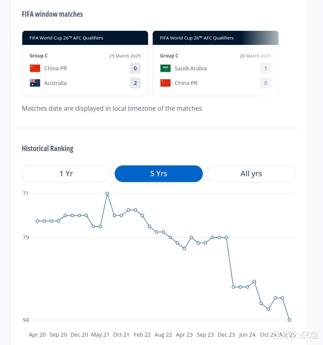国足世界范围内排在第94位,相比于上次(90位)下降了四位,两场世界杯预选赛国足都输球排名垫底,直接获得出线名额已经破灭,附加赛只剩理论上的希望!对比近五年的排名,国足这次再创新低,难道就是没有最低,只有更低?