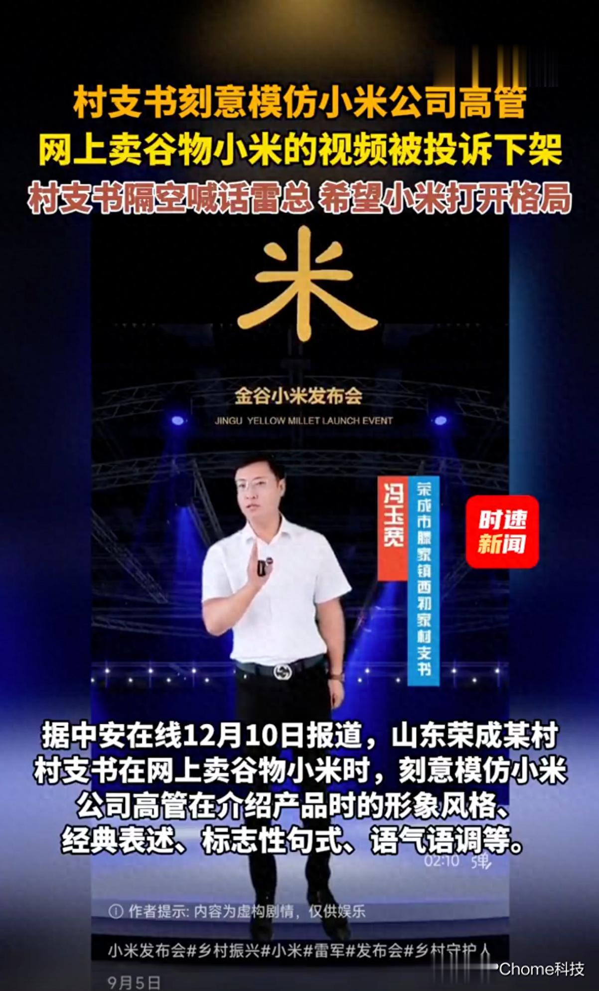 近日,山东威海西初家村村支书冯玉宽因网上售卖谷物小米,其相关推广视频遭小米公司法务投诉下架,引发舆论关注。