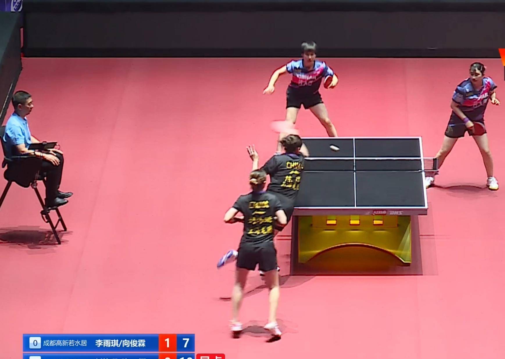 随着比赛的进行,进入局中阶段时,成都高新的女双组合以7-5领先,上海龙腾的刘炜珊和陈熠则陷入了追赶的境地。在接发球和前三板的进攻环节中,二人因紧张而出现了一些小失误,导致对手在局分上迅速拉开差距。成都高新女双在局点时以10-5领先,局势看似不利。然而,刘炜珊与陈熠并未慌乱,稳扎稳打,努力逐渐追回了两分。尽管她们拼尽全力,但最终还是以7-11输掉了这一局,使对手以大比分1-0领先。