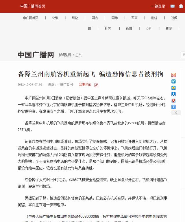中国广播网——备降兰州南航客机重新起飞 编造恐怖信息者被刑拘