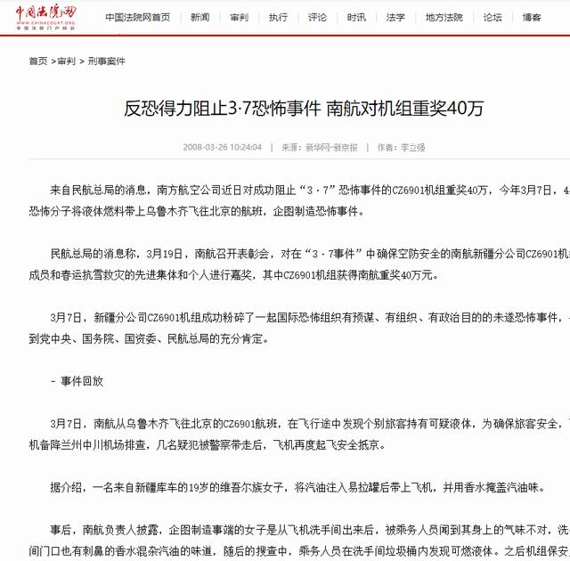 中国法院网——反恐得力阻止3·7恐怖事件 南航对机组重奖40万