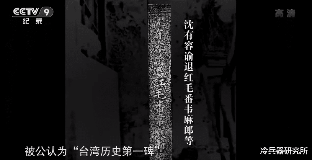 ▲央视纪录片《过台湾第一集》剧照:沈有容喻退红毛石碑截图(此石碑现存于澎湖)