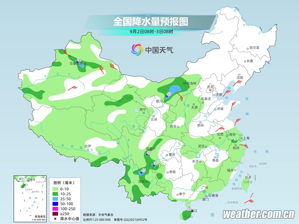 随着天气系统的进一步发展,从9月2日至3日,北方地区将迎来新一轮的降水和冷空气过程。新疆、西北地区、内蒙古、华北、黄淮及东北等地将自西向东经历小到中雨的降水,局地还可能出现大雨或暴雨。降水和冷空气的到来将带来显著的降温效果,预计北方大部分地区气温将下降4~8℃,而新疆、甘肃等地的部分区域降温幅度甚至可能超过10℃。此外,新疆、甘肃及内蒙古西部等地还可能出现沙尘天气,给空气质量带来影响。