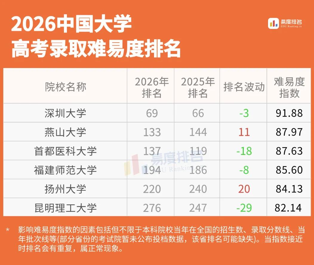 深圳大学、燕山大学、首都医科大学、福建师范大学、扬州大学、昆明理工大学等六所成为“双一流”评选中有力的竞争者。在这场 “实力与热度” 的双重博弈中,6 所特色高校的报考难度排名出现显著波动,既折射出学科发展趋势,更暗藏未来双一流的入围密码。