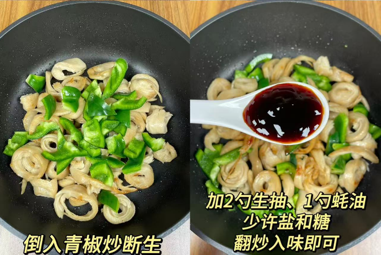- 紧接着倒入切好的青椒块,继续大火翻炒。青椒在高温的作用下会迅速变软,此时要快速翻炒,让青椒与面筋充分混合,炒至断生。