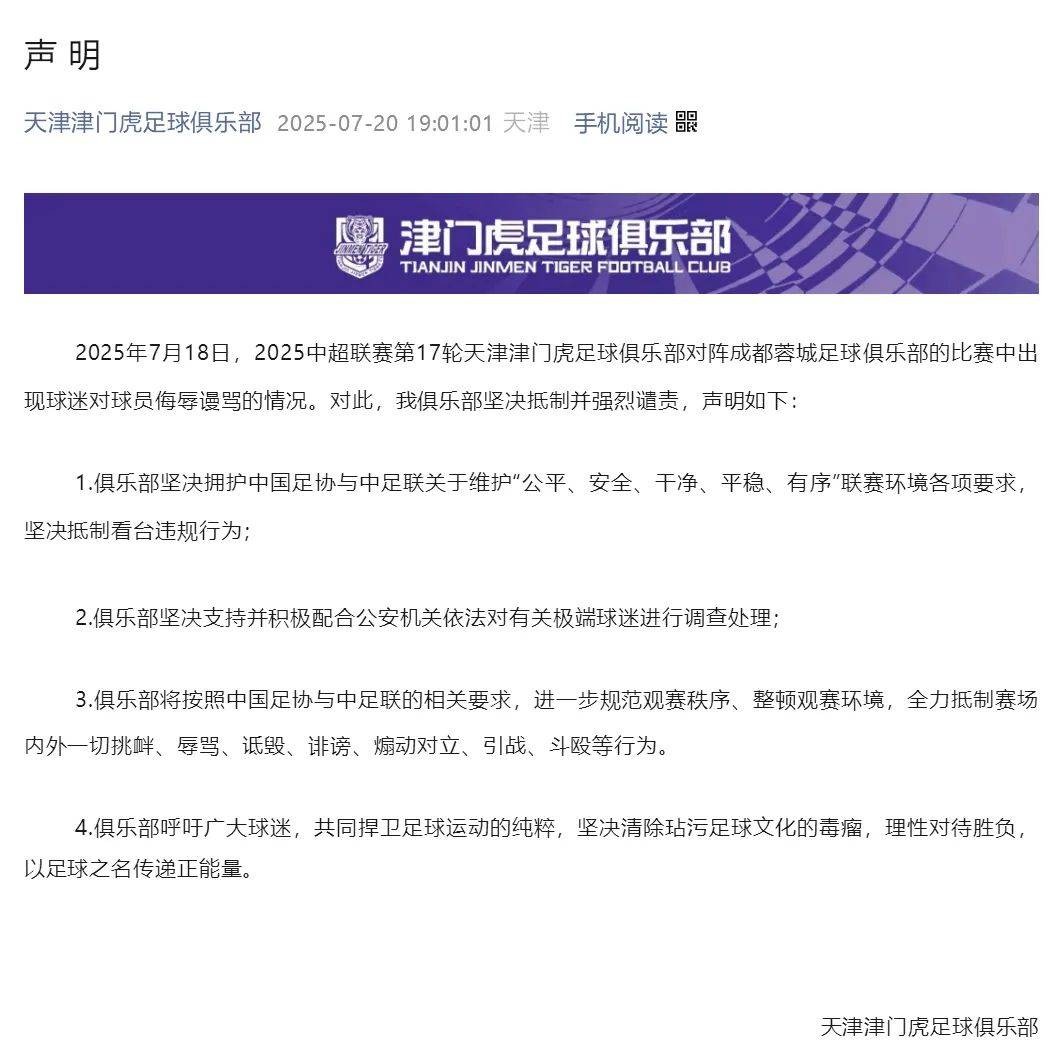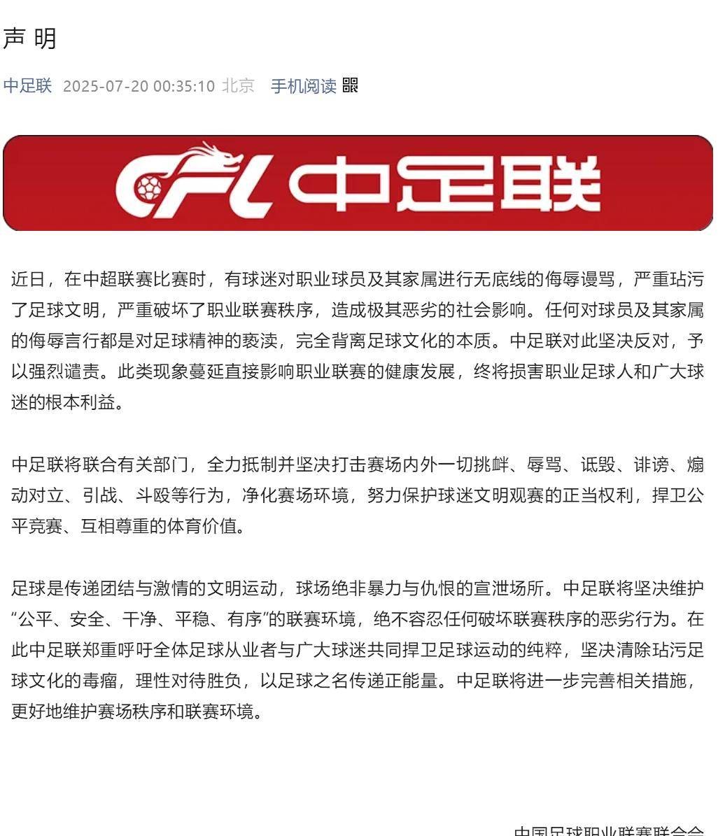 中超联赛第17轮全部比赛结束后,20日凌晨0点37分,中足联发布了官方声明,明确表示:“近日,在中超联赛比赛时,有球迷对职业球员及其家属进行恶意侮辱,严重玷污了足球文明,极大破坏了职业联赛的秩序,造成了恶劣的社会影响。任何侮辱球员及其家属的行为都是对足球精神的亵渎,完全违背了足球文化的核心。”虽然声明没有直接提到天津津门虎与成都蓉城的这场比赛,但其针对性已经不言而喻。