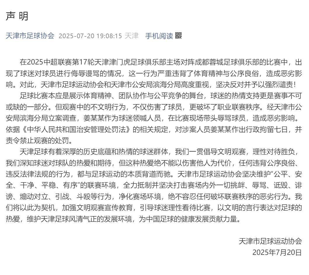 根据该声明,中足联要求所有俱乐部立即转发并重视此事,而这只是一个开始。当天傍晚,天津市足球协会发布公告,表示警方已经介入调查,并宣布了初步的处罚结果:“在2025中超联赛第17轮天津津门虎与成都蓉城的比赛中,部分球迷对球员进行侮辱,严重违背了体育精神和公共道德,造成了恶劣的社会影响。对此,天津市足球协会与天津市公安局滨海分局高度重视,并坚决表示反对与谴责。经过天津市公安局滨海分局的立案调查,姜某某作为球迷领喊人员,带头辱骂球员,已经被行政拘留七日,并被禁止进入球场观看比赛。”