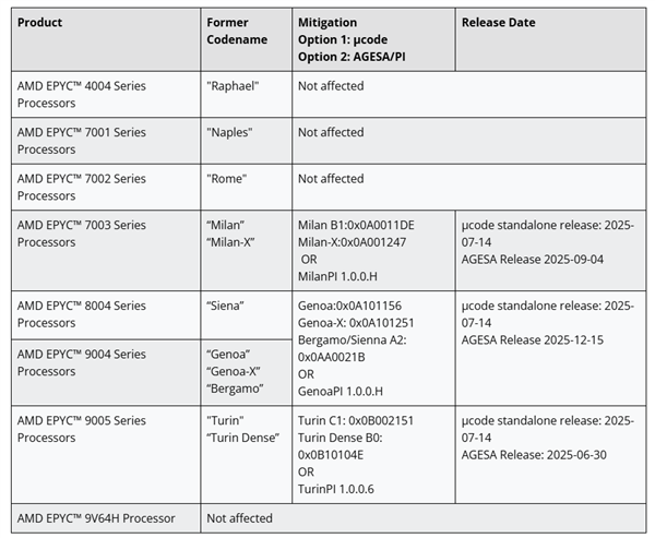 针对存在此低危漏洞的Zen 3/4/5架构的EPYC产品,AMD也早已发布解决措施,只需更新相应的固件版本即可。