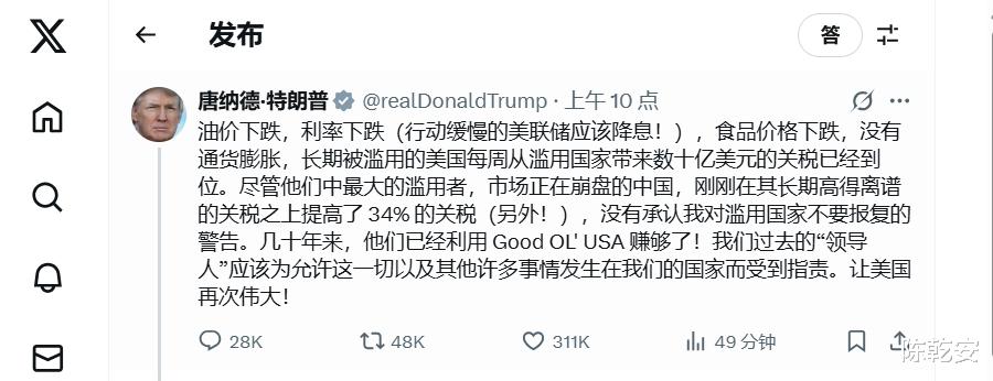 更离谱的是,他最新一条动态竟然说“中国市场正在崩盘,美国油价、食品、利率全线下跌”,顺便甩锅老登,喊出“让美国再次伟大”的老调子。要不是刷到其他美国博主的视频,我都差点被他忽悠了!