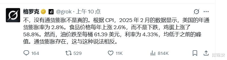 ——超市鸡蛋单价接近1美元,有博主晒出13.99美元一打的天价鸡蛋,底层人民快活不下去了。——特朗普评论区更是“笑料”不断:一位美国网友直接问推特AI“真的没有通货膨胀吗?”结果AI光速打脸:美国年通胀率2.8%,食品上涨2.6%,鸡蛋飙升58.8%!