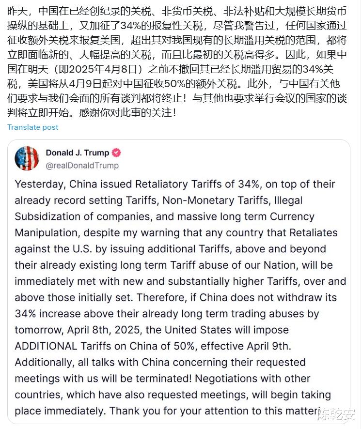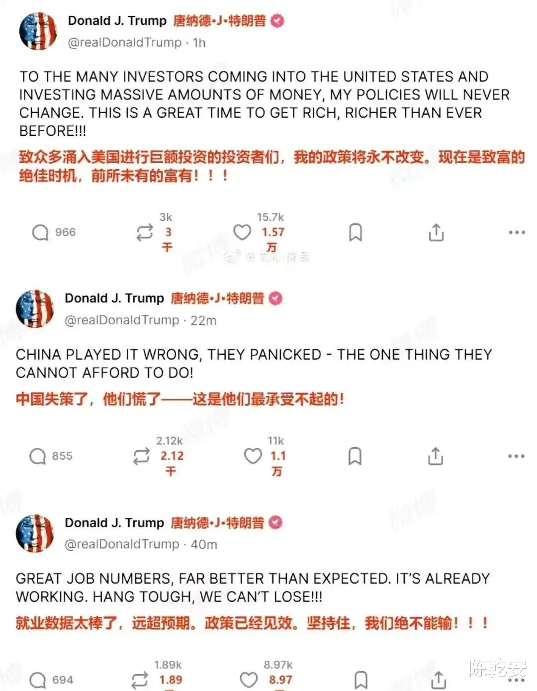 先是深夜0点在自己的社交媒体Truth Social上发帖威胁:“如果中国不撤销34%的反制关税,我将在现有基础上再加50%关税!”随后又连发多条动态,语气夸张到离谱:“中国慌了!就业数据太棒了,我们要挺住!投资者们,现在是致富的最佳时机,快来美国投资吧!”