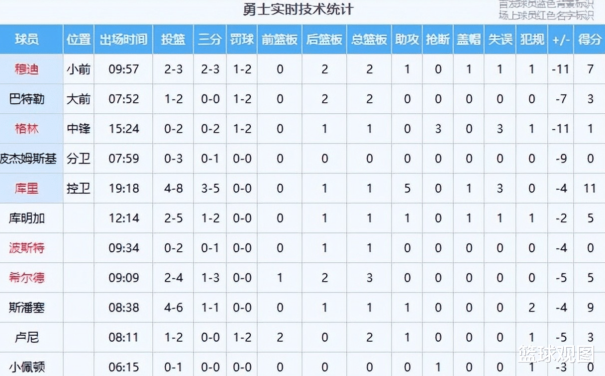 库里20分5板9助、穆迪12分2板1助、波斯特12分2板1助、库明加11分3板2助、斯潘塞11分1板1助、格林8分5板1助3断、卢尼5分4板3助、希尔德5分4板1助、巴特勒3分2板